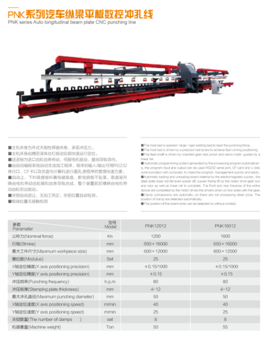 PNK系列汽車縱梁平板數(shù)控沖孔線:自動(dòng)上料、沖孔、自動(dòng)下料,全線自動(dòng)運(yùn)行。適用于汽車縱梁的全自動(dòng)批量生產(chǎn)。加工范圍可跟據(jù)客戶需求進(jìn)行定制。